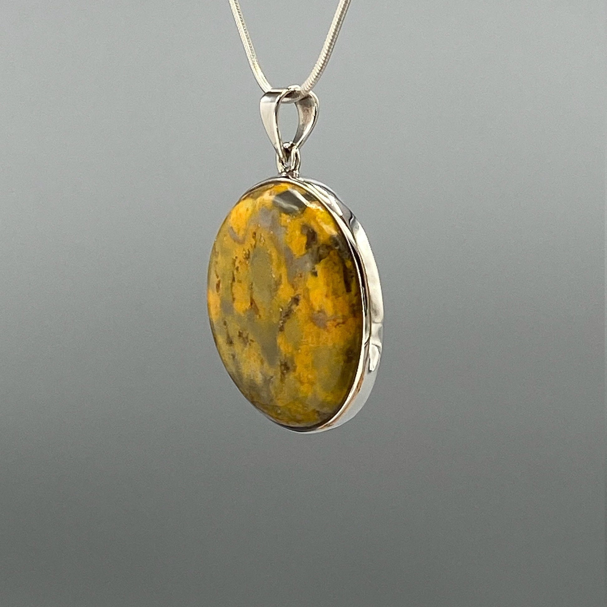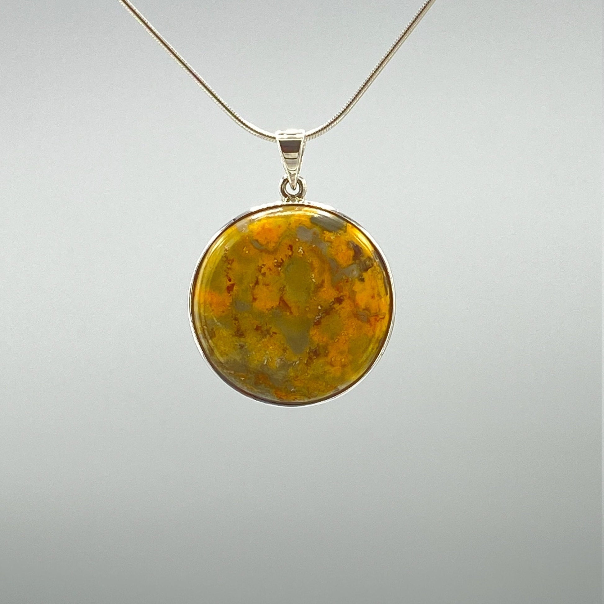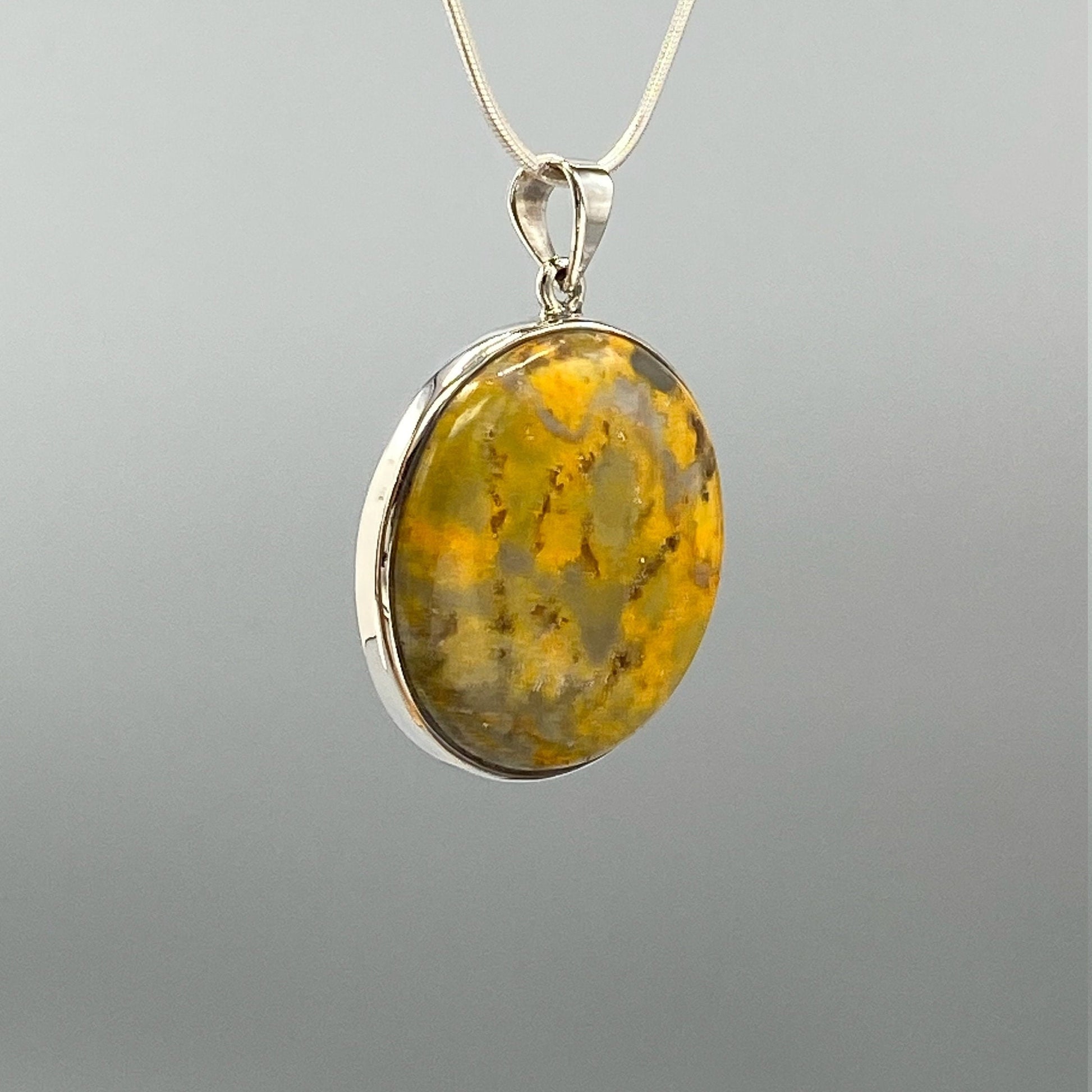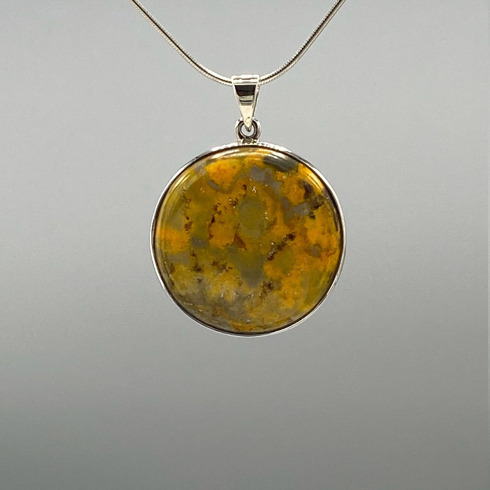 Beautiful medium size natural bumble bee jasper pendant. Handmade high quality 925 silver one of a kind. Natural bumble bee jasper stone. Very stylish and perfect for everyday wear. This beautiful pendant would also make a perfect gift for any healing stones passionate person. Round, Yellow, Orange.