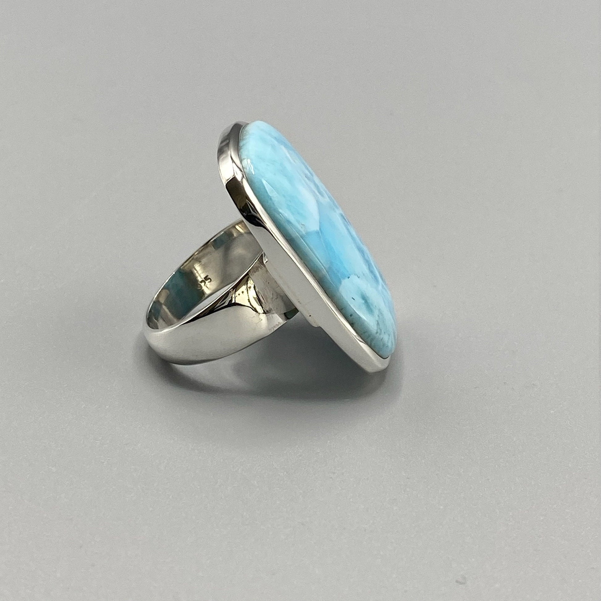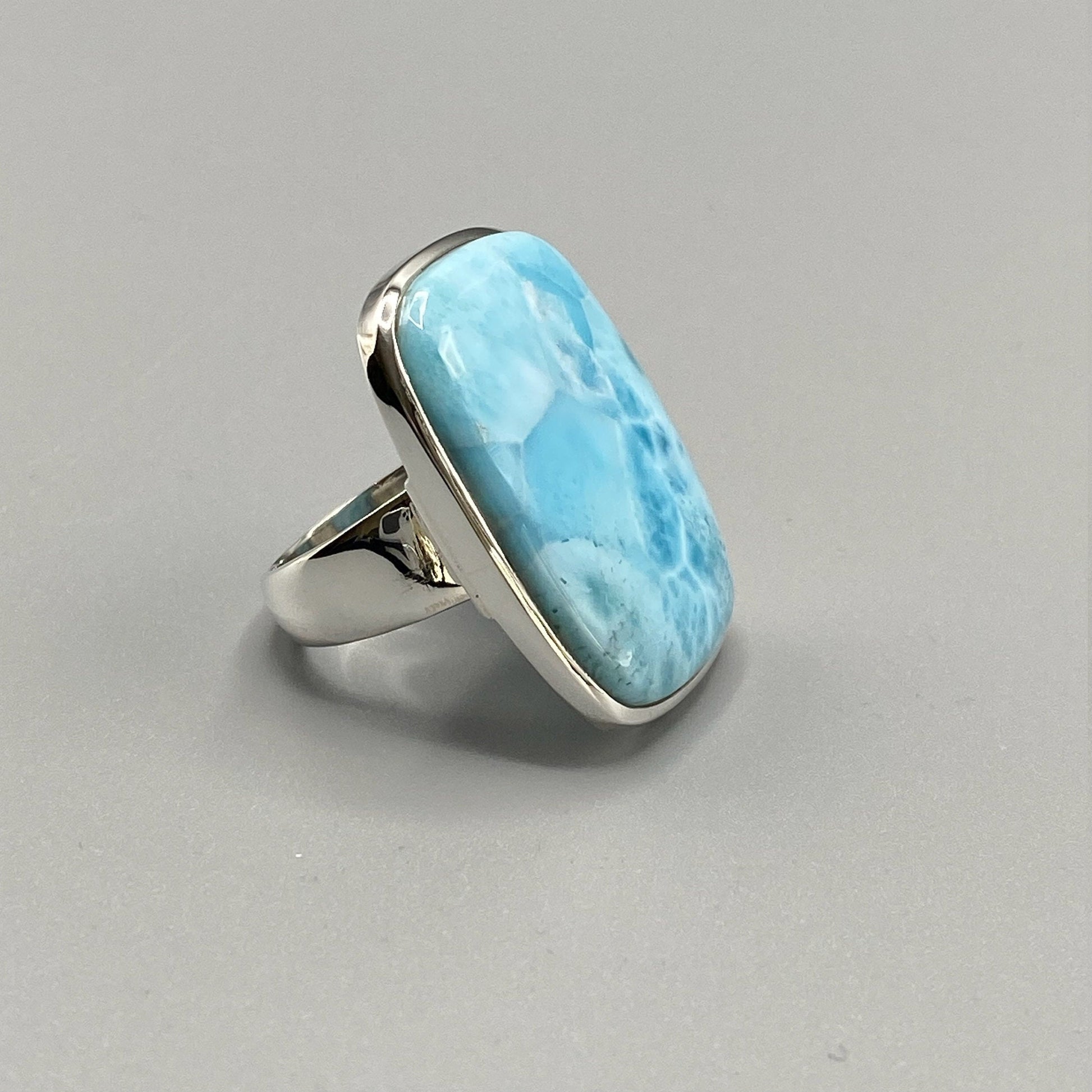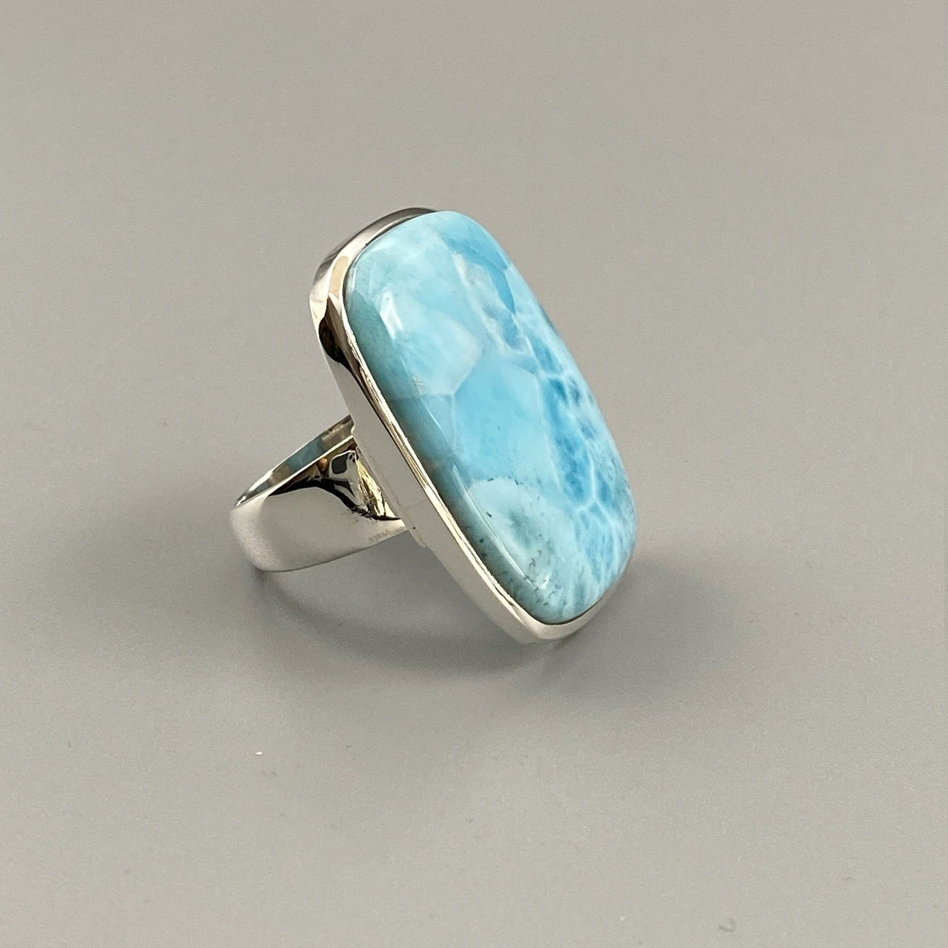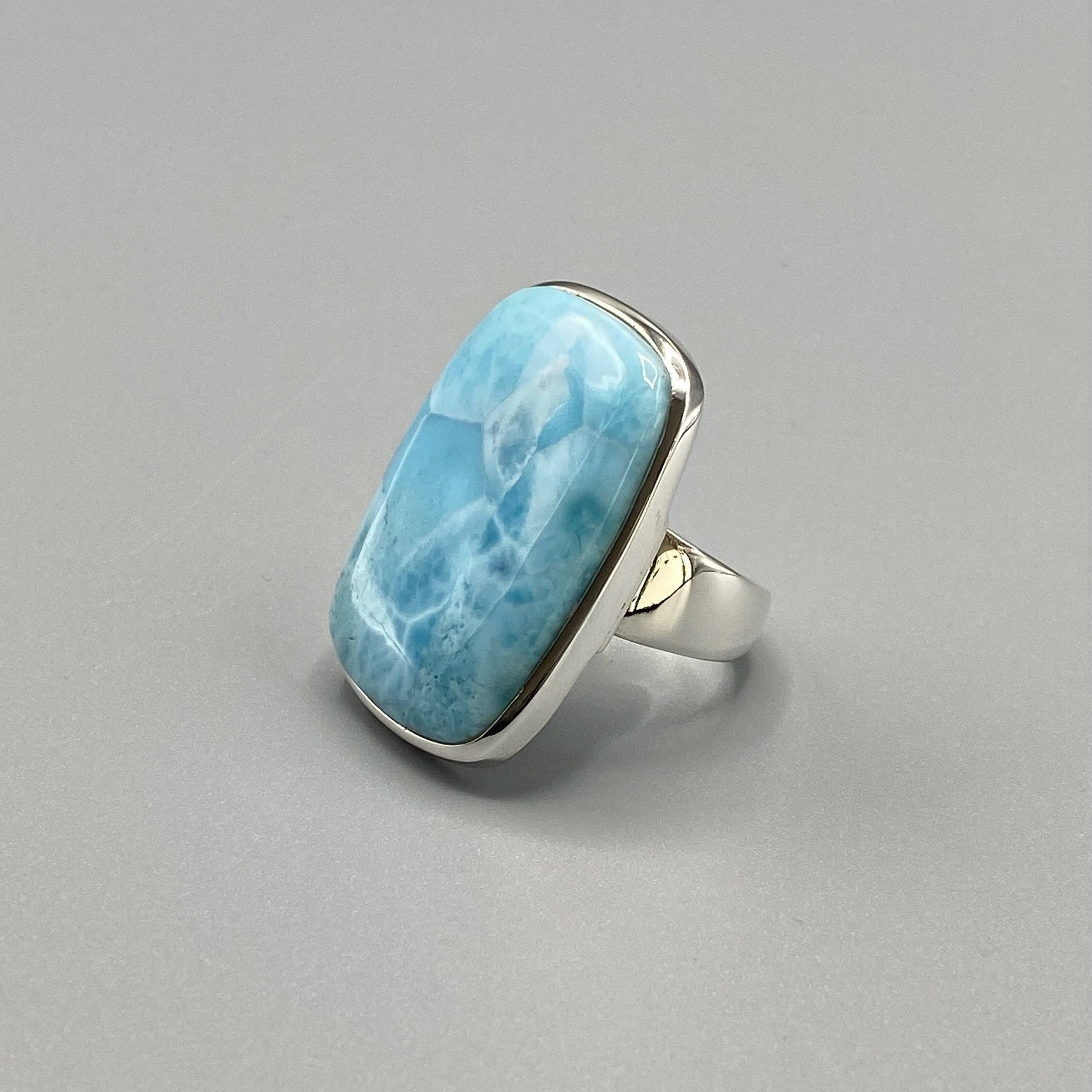 Beautiful natural Larimarl rectangle Large ring. Handmade high quality 925 silver one of a kind. Natural Larimar stone. Very stylish for her or him and perfect for everyday wear. This beautiful ring would also make a perfect gift for any healing stones passionate person.