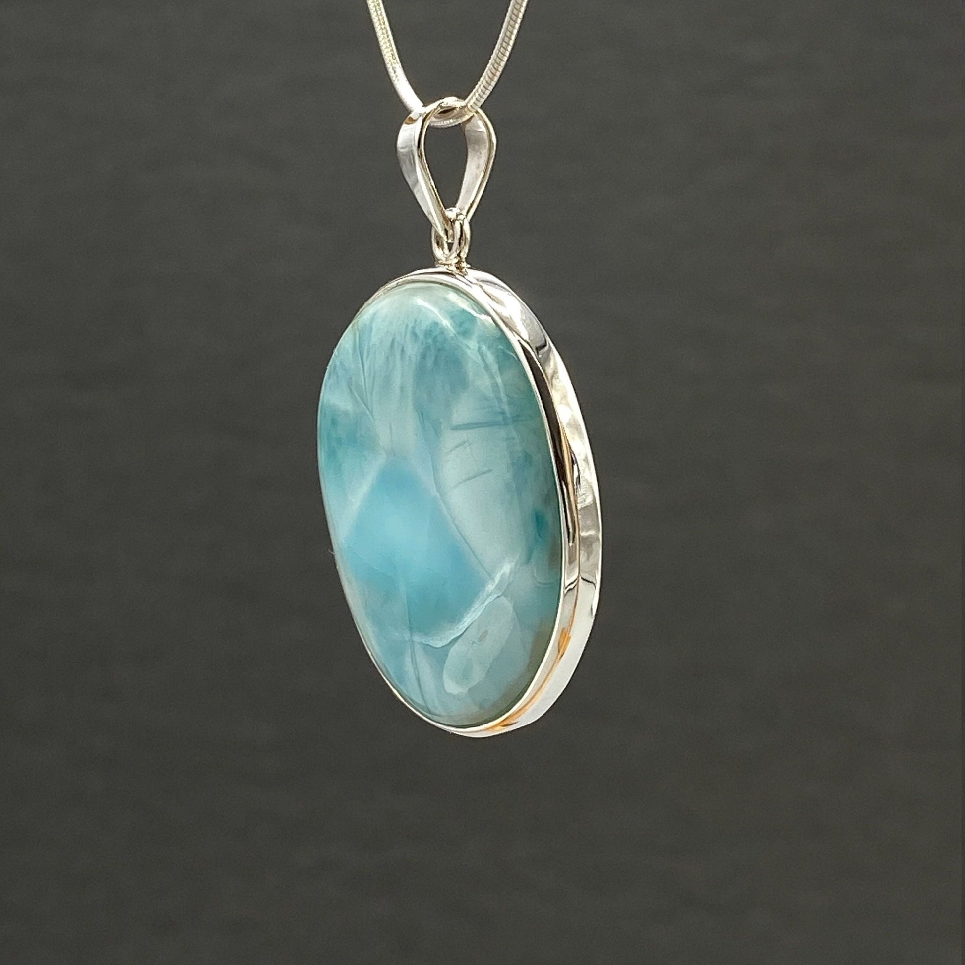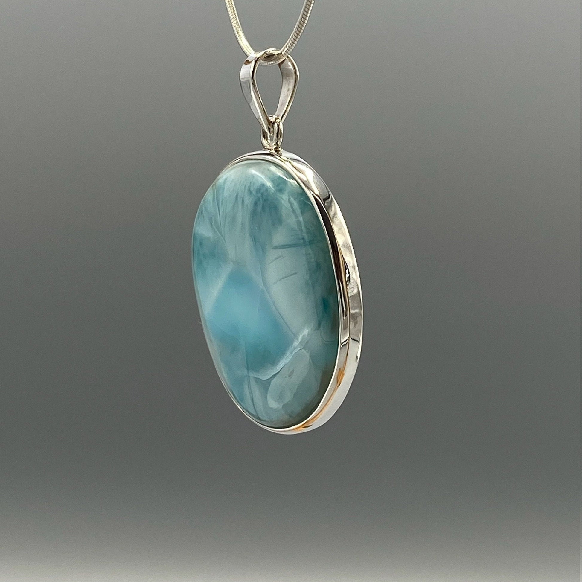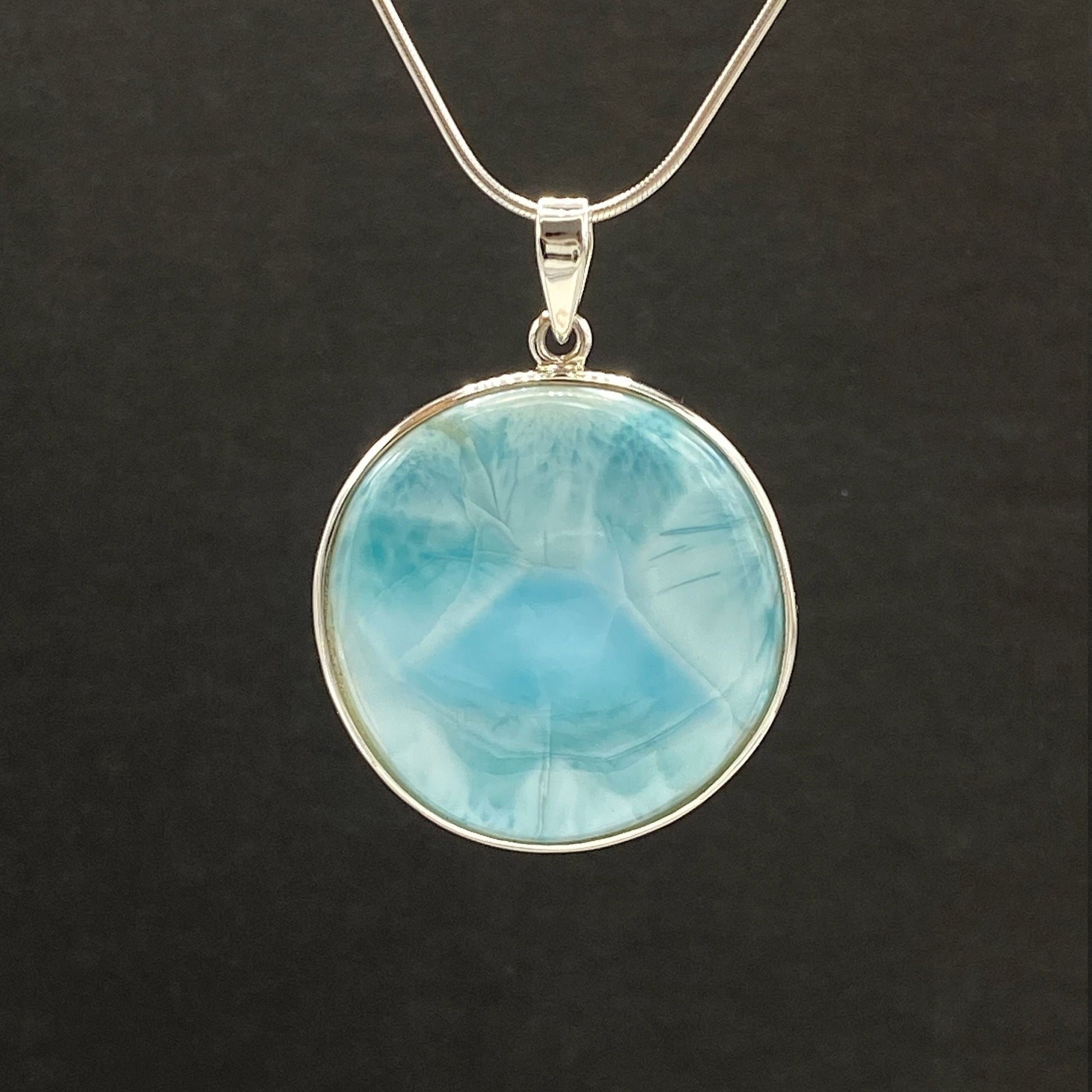 Beautiful natural Larimar pendant. Handmade high quality 925 silver one of a kind. Natural Larimar stone. Very stylish and perfect for everyday wear. This beautiful pendant would also make a perfect gift for any healing stones passionate person. Round, Blue.